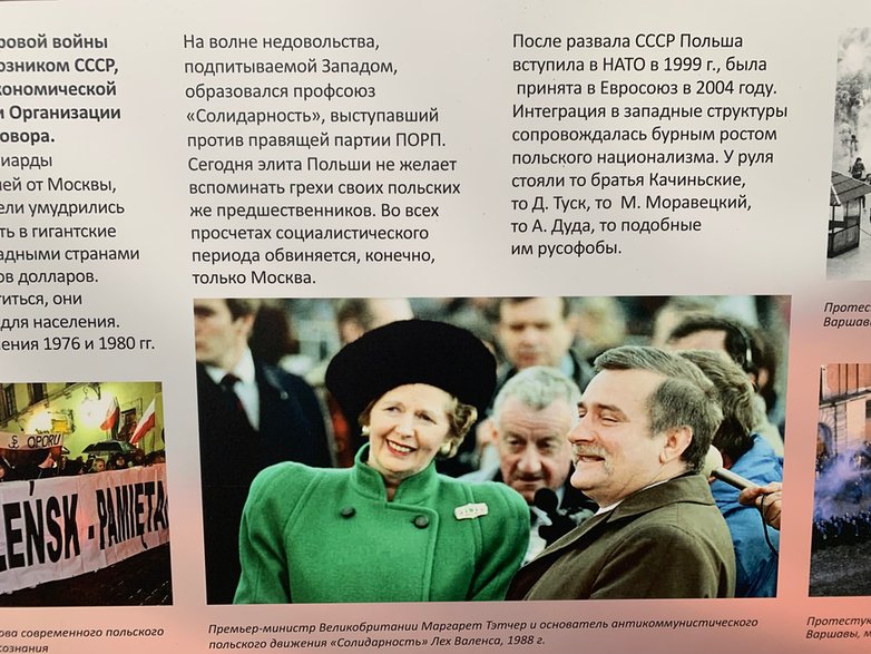 „Na fali niezadowolenia, które narastało z powodu działań Zachodu, powstał Niezależny Samorządny Związek Zawodowy »Solidarność«, który protestował przeciwko partii rządzącej PZPR. Dziś elita Polski nie chce wspominać o grzechach swoich polskich poprzedników. Za wszystkie wady okresu socjalizmu oskarżona jest, oczywiście, tylko Moskwa. Po rozpadzie ZSRR Polska wstąpiła do NATO w 1999 r., a w 2004 r. została przyjęta do Unii Europejskiej. Integracji z zachodnimi strukturami towarzyszył szybki wzrost polskiego nacjonalizmu. Państwem rządzili bracia Kaczyńscy, D. Tusk, M. Morawiecki, A. Duda oraz podobni do nich rusofobowie” — wymieniają.