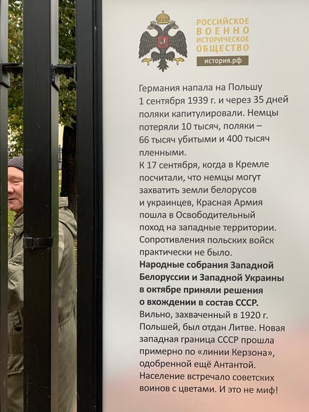 „Niemcy zaatakowały Polskę 1 września 1939 r. Minęło 35 dni i Polacy kapitulowali. Niemcy stracili 10 tys. żołnierzy, Polska — 66 tys. zabitych i 400 tys. rannych. 17 września, kiedy Kreml obawiał się, że Niemcy mogą przejąć ziemie Białorusinów i Ukraińców, Armia Czerwona wyruszyła z kampanią wyzwoleńczą w kierunku zachodnich terytoriów. Polskie wojsko prawie nie stawiało oporu. Zgromadzenia ludowe Zachodniej Białorusi i Zachodniej Ukrainy w październiku podjęły decyzję o dołączeniu do ZSRR. Wilno, które w 1920 r. przejęła Polska, wróciło do Litwy. Nowa zachodnia granica ZSRR przebiegała zgodnie z »Linią Curzona«, zatwierdzoną przez Ententę. Ludzie witali radzieckich żołnierzy z kwiatami. I to nie mit” — twierdzą autorzy.