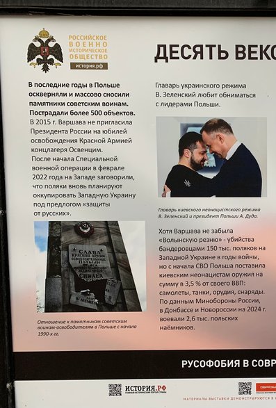 A oto finał wystawy, który ma pokazywać, że „rusofobia w Polsce trwa nadal”. Autorzy nie zapomnieli o antyukraińskiej propagandzie. Wołodymyr Zełenski przedstawiony na zdjęciu z Andrzejem Dudą, nazywany jest „przywódcą kijowskiego neonazistowskiego reżimu”.