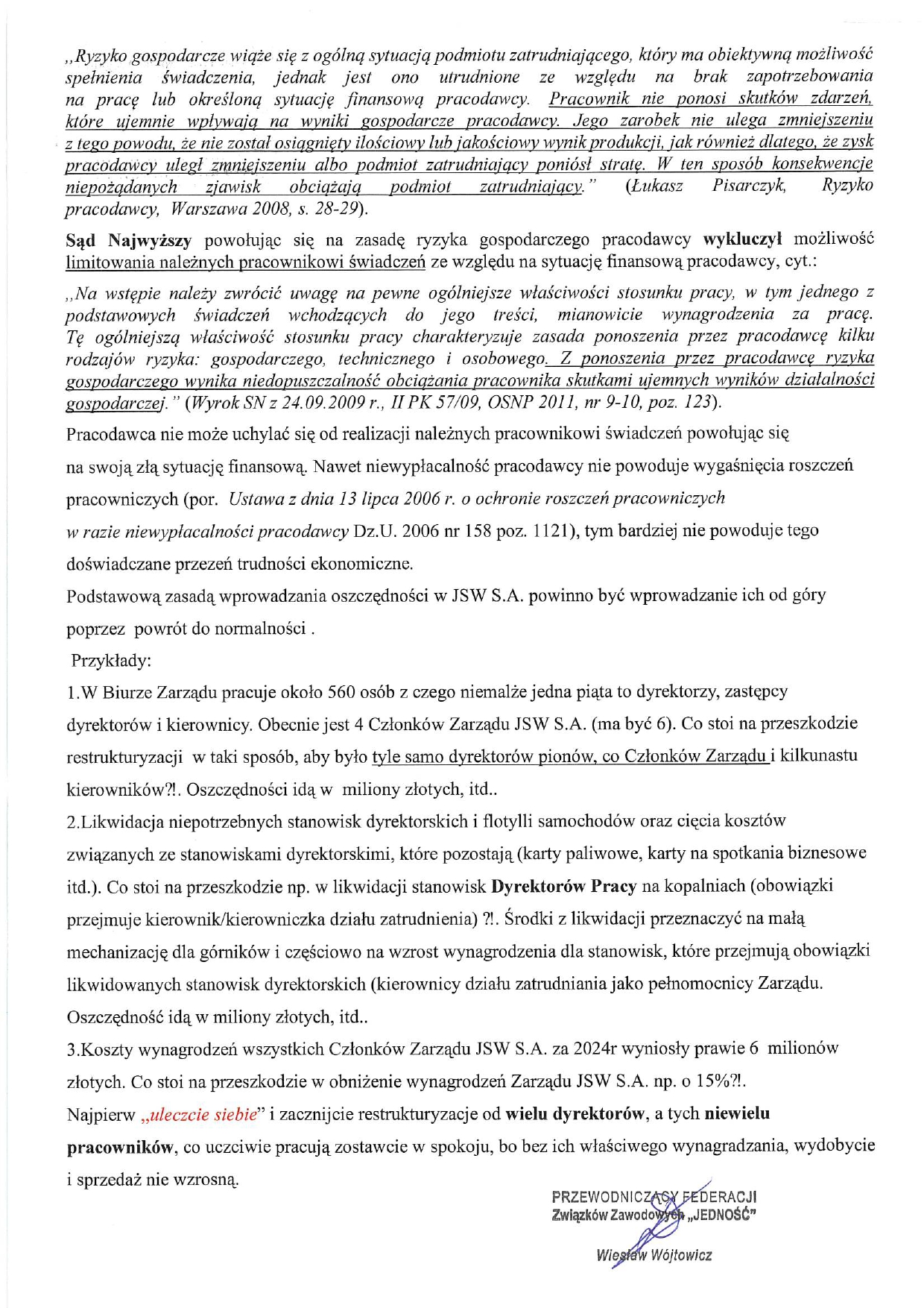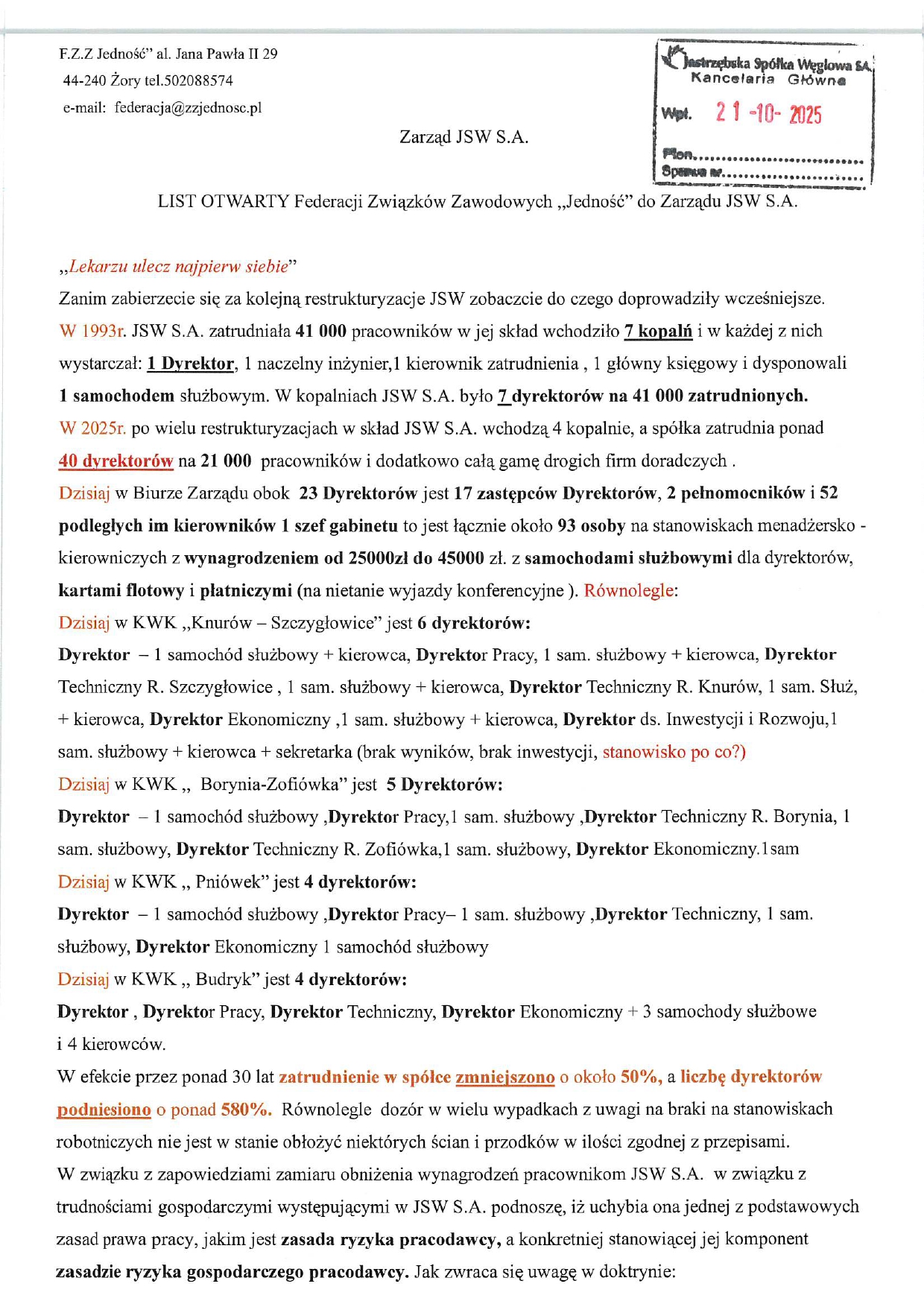 List podpisany przez Wiesława Wójcika, przewodniczącego Federacji Związków Zawodowych „Jedność”, kończy się apelem o rozsądek i realne działania oszczędnościowe, które nie będą obciążać szeregowych pracowników.