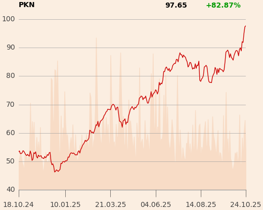 Widać to w liczbach. Gdy notowania jednej akcji Orlenu ustanawiały historyczny rekord, wartość całej spółki przekraczała 57 mld zł. Obecnie – gdy jedna akcja jest mniej więcej o jedną czwartą tańsza – przedsiębiorstwo jako całość jest warte 113 mld zł. Ta rekordowa kapitalizacja to efekt rajdu notowań, jaki nastąpił w 2025 r. W niespełna 10 miesięcy kurs Orlenu wzrósł o 107 proc.