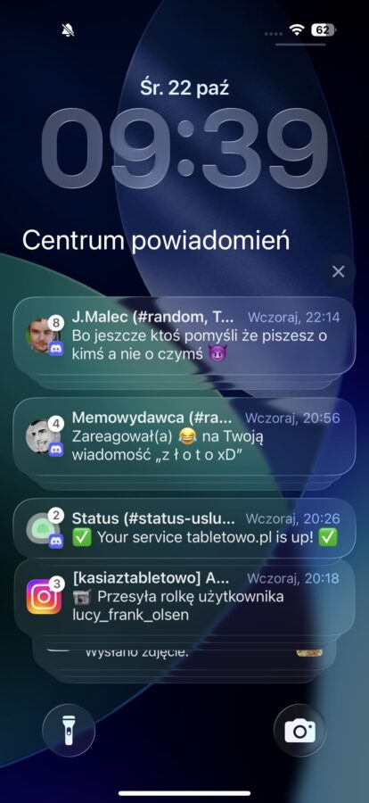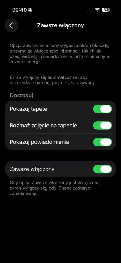 Oczywiście, jak przystało na iPhone’a, mamy tu dwie składowe: Dynamic Island, czyli dynamiczną wyspę, która wyświetla np. minutnik, aktualnie odtwarzany utwór czy np. pozostały czas oczekiwania na Bolta czy innego Ubera, jak również Always on Display, które może wyświetlać się (i domyślnie tak właśnie jest) z przygaszoną tapetą.