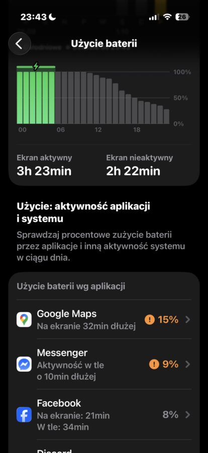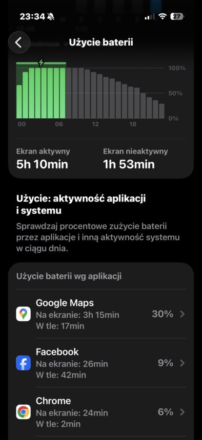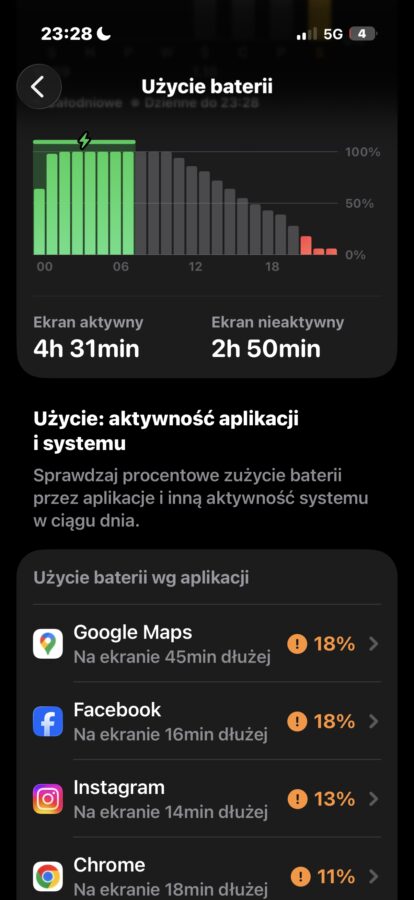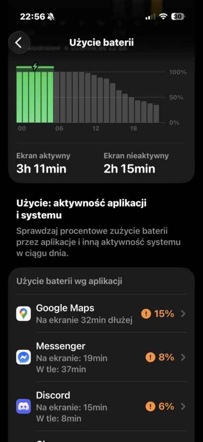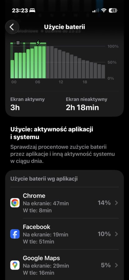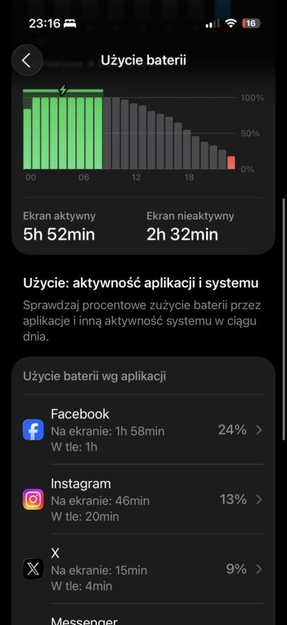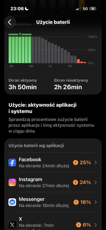 Korzystając z telefonu mniej intensywnie, na WiFi udawało mi się kończyć dzień, mając nawet ok. 40-45% zapasu, a wskazania ekranu aktywnego to ok. 3 godzin. Na 5G z kolei nie udało mi się nigdy skończyć dnia z jakimkolwiek zapasem, a ekran aktywny pokazywał niecałe 4 godziny. Oznacza to, że – mając trudniejszy dzień na mieście czy po prostu dużo korzystając z telefonu na 5G – iPhone 17 może rozładować się nawet wczesnym wieczorem. W trybie mieszanym jest nieźle, ale też nie powiedziałabym, że rewelacyjnie. Na dzień pracy wystarczy, ale to tyle.