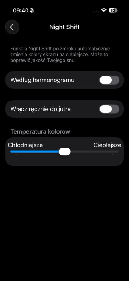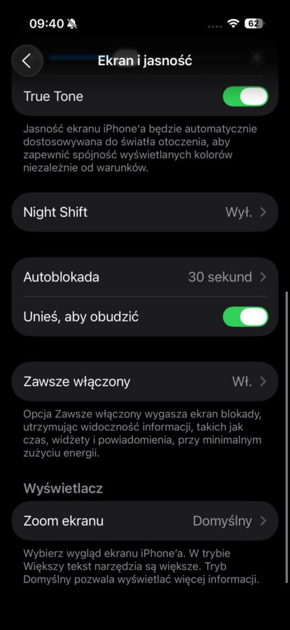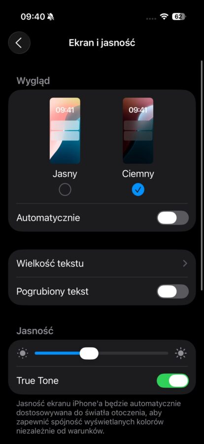 I tak właściwie w ustawieniach ekranu nie znajdziemy zbyt wiele, bo Apple uważa, że dostarcza użytkownikowi najlepszy ekran, którego nie trzeba w żaden sposób ulepszać.