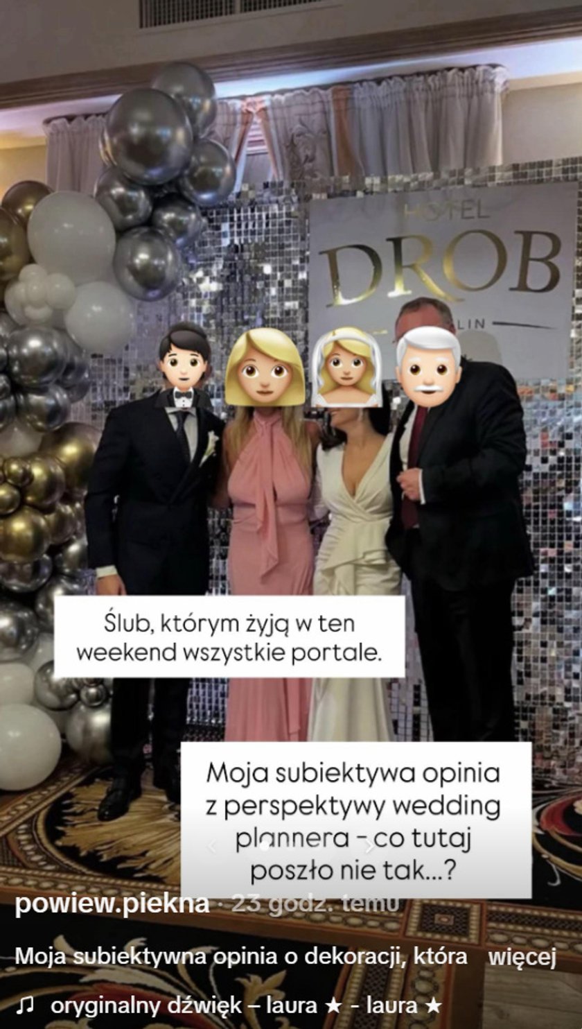 Najbardziej jednak od wedding plannerki „dostało się” dekoracjom, które miały tworzyć ściankę, na której mogli pozować goście i młoda para. „Balonowo-cekinowa ścianka to dla mnie klimat sylwestrowy/18-ste urodziny” — zauważa specjalistka. To jednak nie wszystko.
