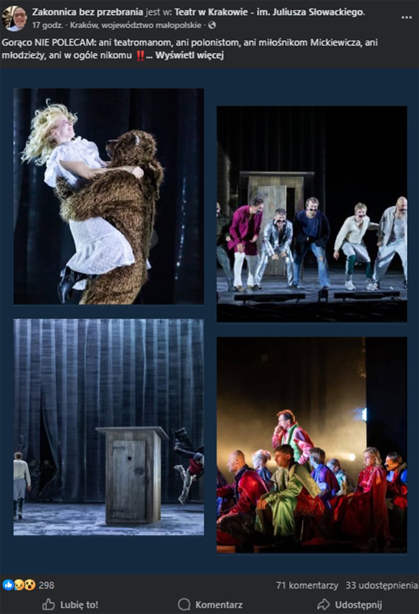 „Spektakl o niczym, dramatycznie zły. Było to widać po reakcjach widowni. Niektórzy nie wrócili po przerwie, jedna pani w loży obok siedziała w telefonie… ale już musiałam, że to ze mną jest coś nie tak, bo rzucały mi się w oczy same pozytywne recenzje. Dzięki za ten wpis, nie muszę się martwić, że coś ze mną nie tak” — napisała jedna z internautek.