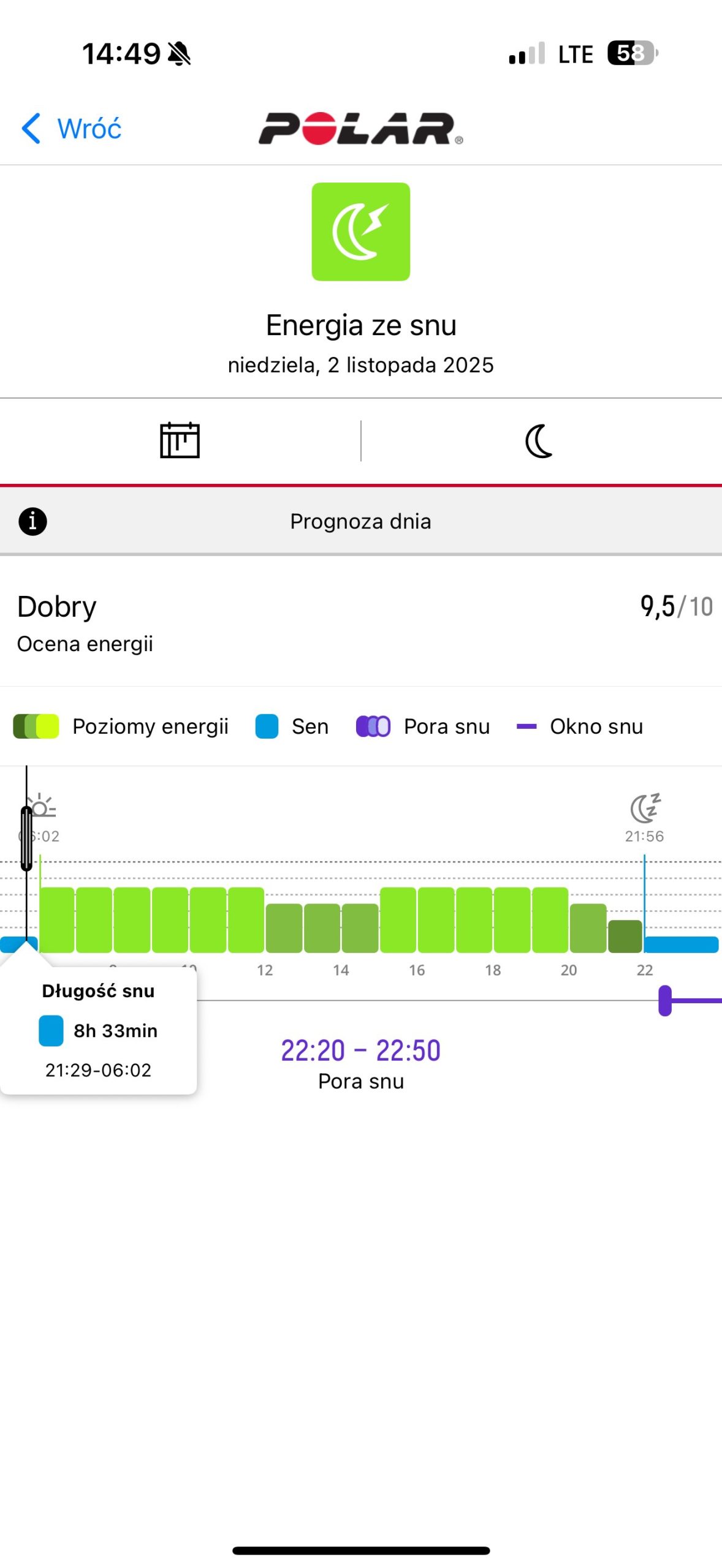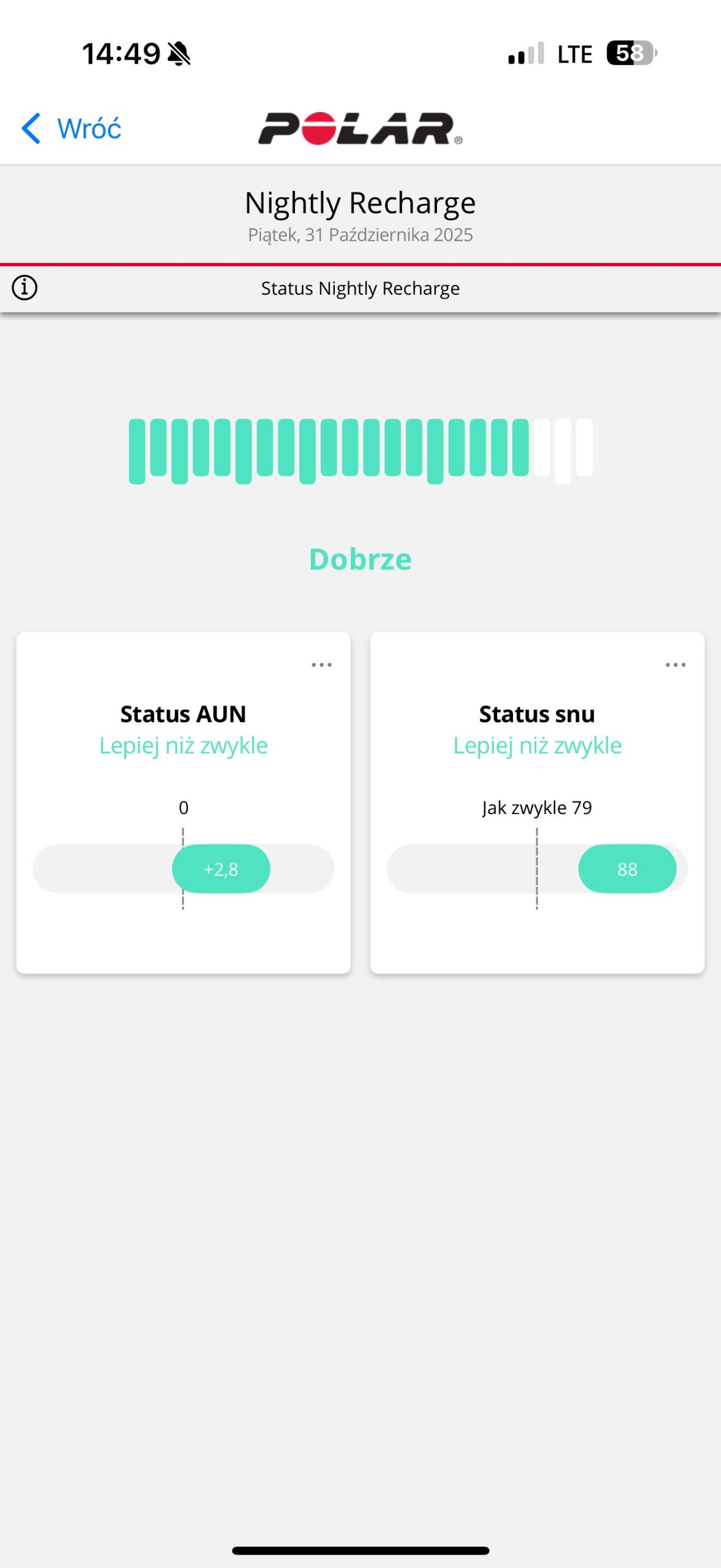 Nightly Recharge wskazuje, w jakim stopniu zregenerowałeś się podczas snu po codziennych obowiązkach i treningach. Dzięki temu codziennie możesz dokonywać wyborów, które w optymalny sposób przyczynią się do zachowania dobrego samopoczucia i osiągania celów treningowych. Regeneracja odgrywa kluczową rolę w osiąganiu lepszych wyników sportowych, optymalnym funkcjonowaniu podczas dnia oraz utrzymywaniu dobrego samopoczucie i zdrowia. Nightly Recharge wskazuje stopień nocnej regeneracji po codziennych obowiązkach i treningach.