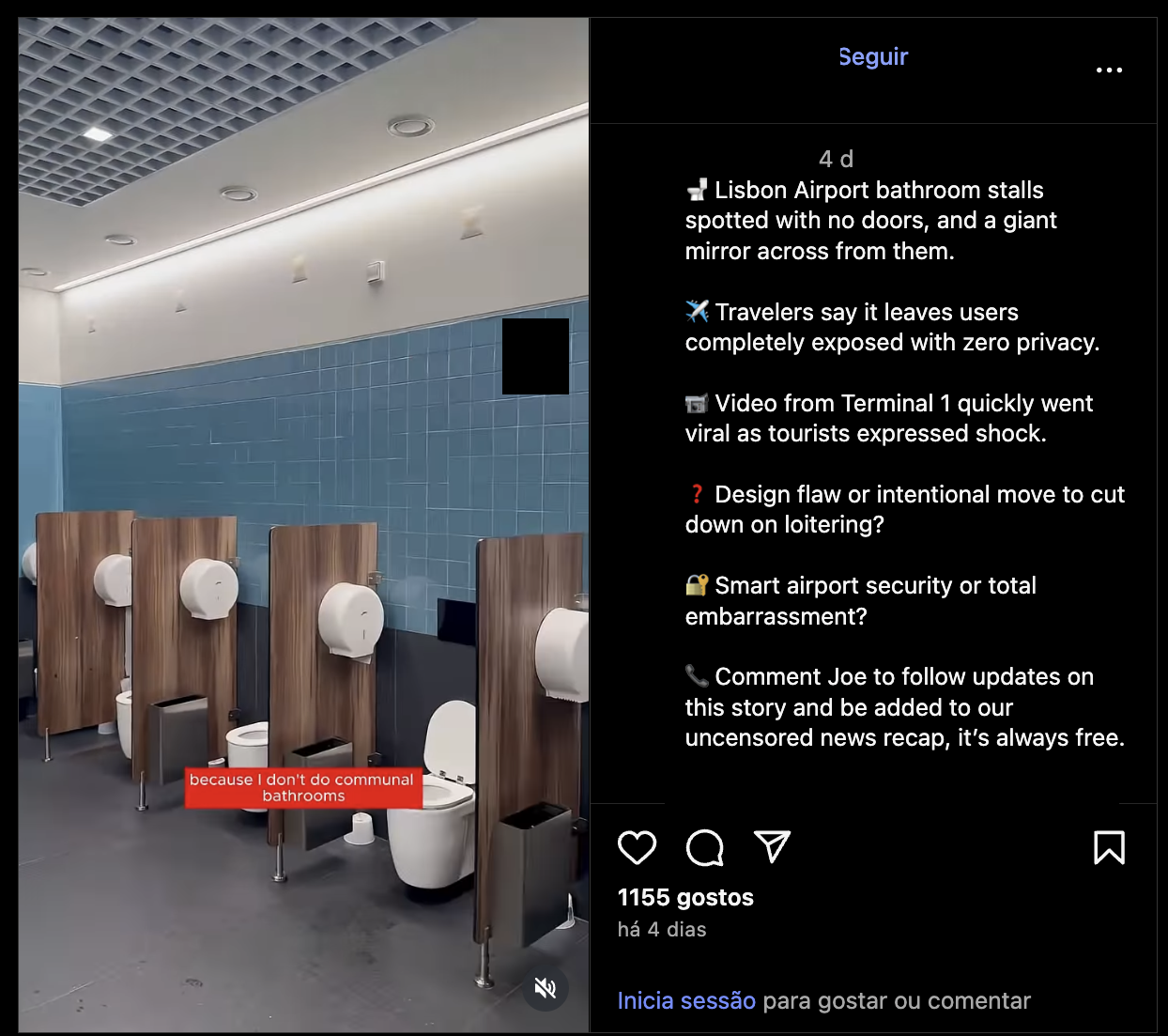 Em mensagem enviada ao Polígrafo, um leitor partilhou um vídeo viral publicado no Instagram que mostra uma casa-de-banho sem portas em frente a cada sanita que, supostamente, está localizada no aeroporto de Lisboa. Além da falta de portas, existe, na parede oposta, um grande espelho, que permite ver todas as sanitas.