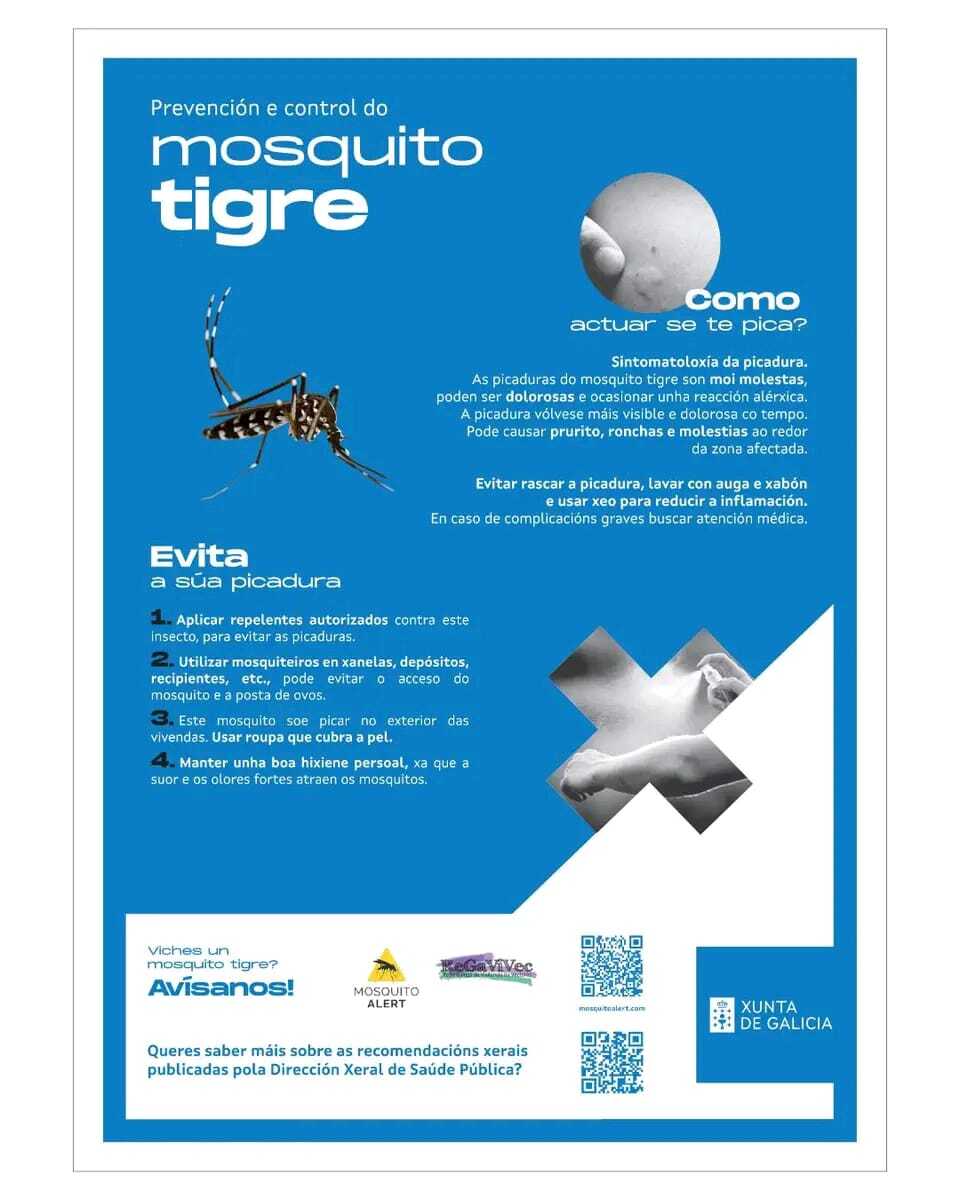 No site do Serviço Galego de Saúde (SERGAS), o mosquito conhecido cientificamente como “Aedes albopictus” é descrito como sendo “de cor negra, com uma linha branca desde a cabeça ao tórax e manchas brancas nas patas e no abdómen”. “É uma espécie principalmente urbana, ativa sobretudo durante o dia e que se esconde em zonas sombrias. Pode transmitir doenças às pessoas, com a dengue, chikungunya ou zika. Ainda que a probabilidade seja muito pequena, o controlo deste mosquito é primordial”, informa, indicando formas de combate à espécie, que se cria em águas paradas, e também de evitar picadas, como aplicação de repelentes específicos, utilização de mosquiteiras nas janelas, depósitos e recipientes, para evitar o acesso e a desova. Indica também que a picada “é muito dolorosa e pode causar reação alérgica”, deve evitar-se coçar e que em caso de complicações deve procurar-se ajuda médica.