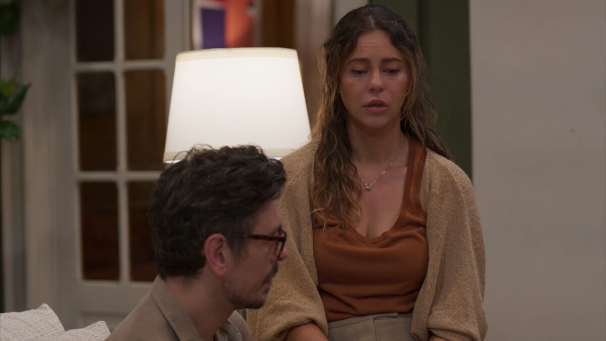 Ela não entende a presença do ex-marido ali (Foto: Reprodução, Globoplay)
