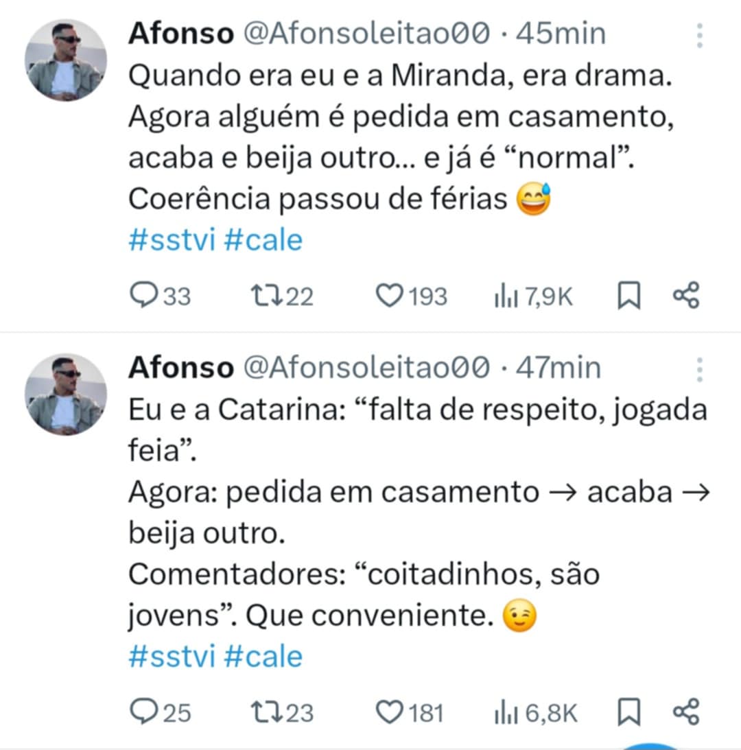 No “X”, o ex-concorrente lamentou: “Eu e a Catarina: “falta de respeito, jogada feia”. Agora: pedida em casamento → acaba → beija outro. Comentadores: “coitadinhos, são jovens”. Que conveniente. 😉”.