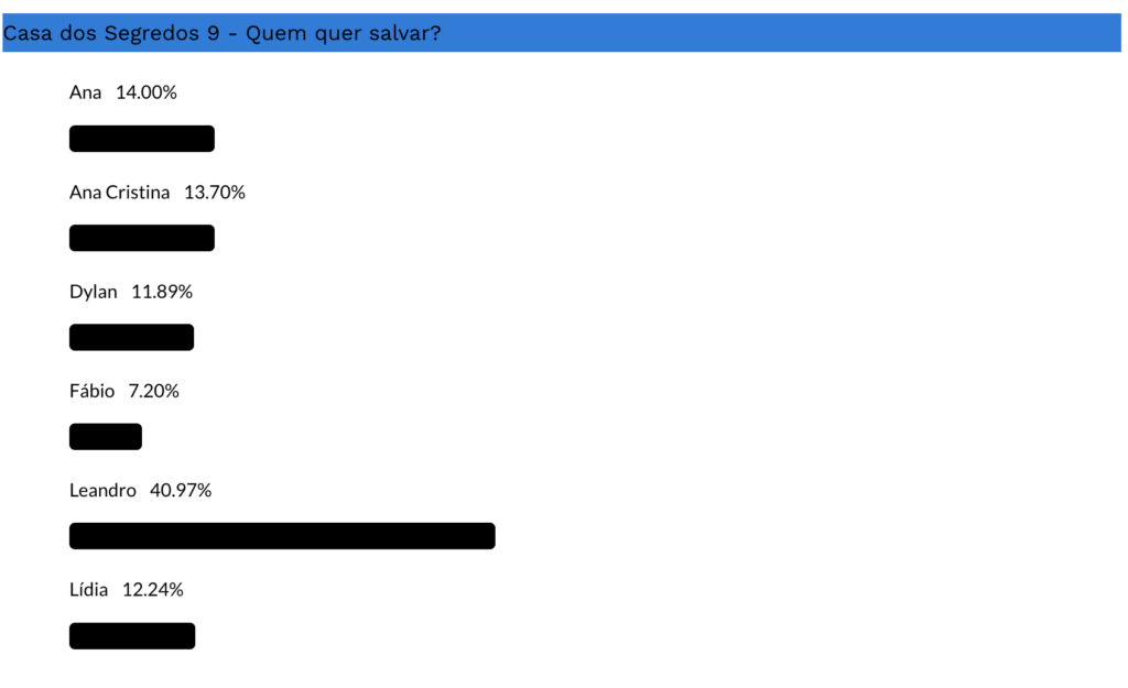 Na sondagem que decorre no nosso blog, Leandro é o concorrente mais votado para salvar com 40,97% dos votos, seguido de Ana com 14% dos votos e Ana Cristina com 13,70% dos votos. Entre os menos votados temos Lídia com 12,24%, Dylan com 11,89% dos votos e Fábio com apenas 7,20% dos votos.
