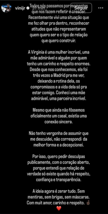 O atacante Vinicius Júnior utilizou as redes sociais para se desculpar com Virginia Fonseca. Vini Jr. publicou, na noite desta quarta-feira (08), um pedido de desculpas à influenciadora.