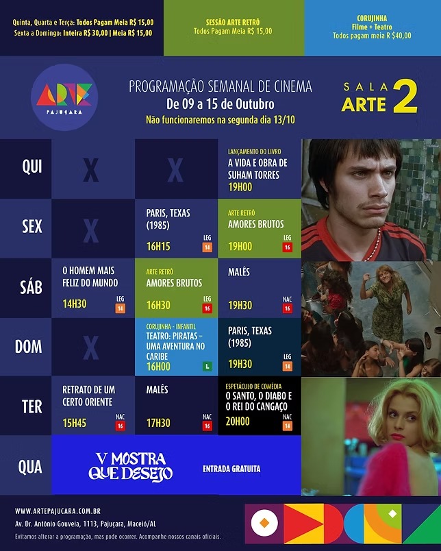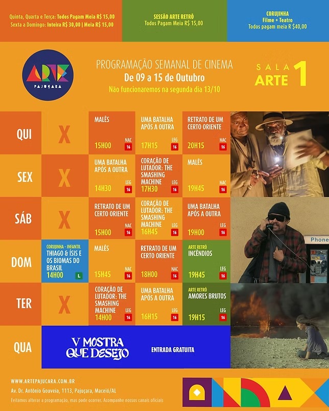 Para conferir a programação completa de todos os filmes em cartaz no Arapiraca Partage Shopping, Centerplex (Shopping Pátio Maceió), Cinesystem (Parque Shopping) e Kinoplex (Maceió Shopping): basta clicar aqui. Já para o Shopping da Vila, em Delmiro Gouveia, pode ser conferida aqui.