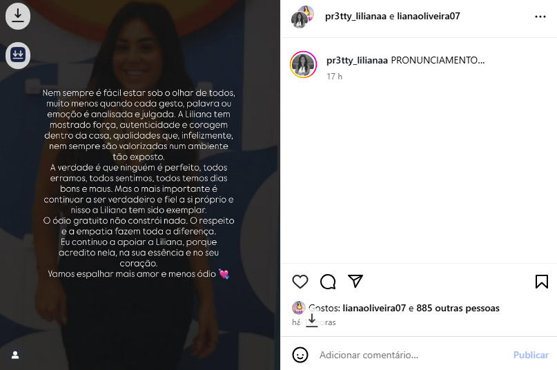 Quem gere as redes sociais de Liliana, partilhou na sua conta oficial o seguinte texto: “Nem sempre é fácil estar sob o olhar de todos, muito menos quando cada gesto, palavra ou emoção é analisada e julgada. A Liliana tem mostrado força, autenticidade e coragem dentro da casa, qualidades que, infelizmente, nem sempre são valorizadas num ambiente tão exposto“.