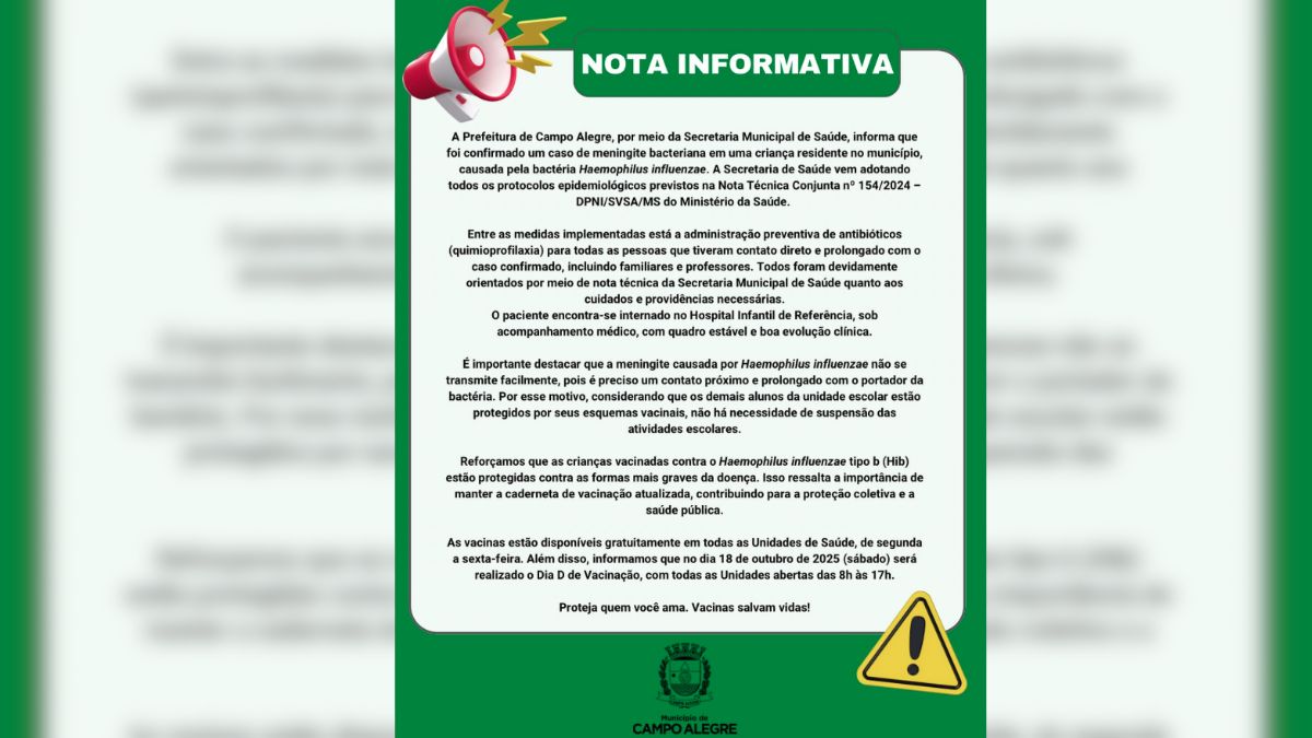 Uma criança foi internada em Campo Alegre, no Norte de Santa Catarina, após a confirmação do segundo caso de meningite bacteriana na região. O comunicado foi divulgado pela prefeitura nessa quarta-feira (8) e informa que a doença foi causada pela bactéria Haemophilus influenzae. Pessoas que tiveram contato próximo com o paciente já passam por tratamento preventivo.
