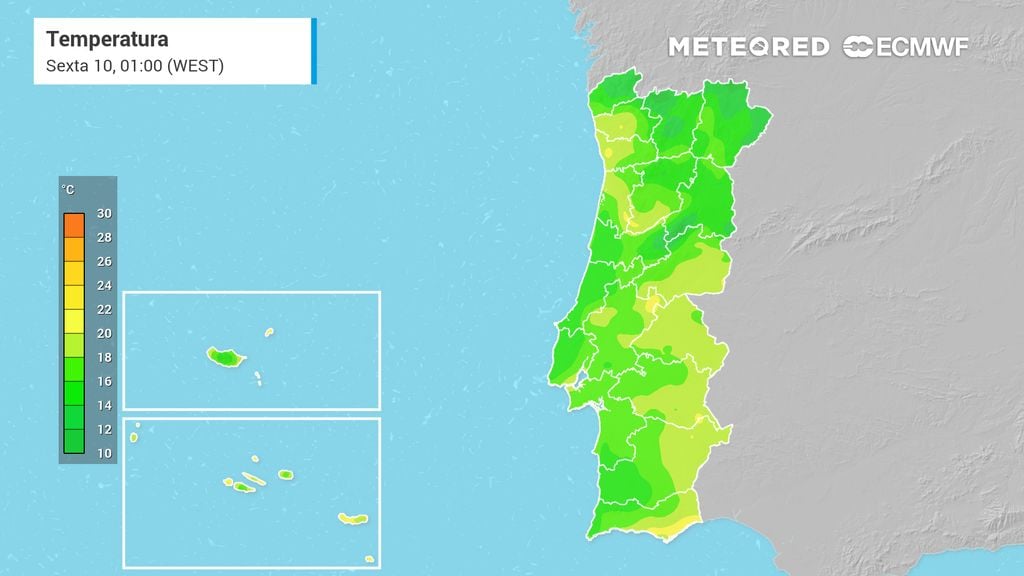 As temperaturas máximas oscilarão entre 21 °C e 23 °C no Norte, 24 °C a 26 °C no Centro, e poderão atingir 28 °C no Alentejo e Algarve, devido ao transporte de ar mais quente do interior ibérico. O vento soprará de noroeste, fraco a moderado no interior e mais intenso junto ao litoral ocidental, com rajadas de 35 a 40 km/h.