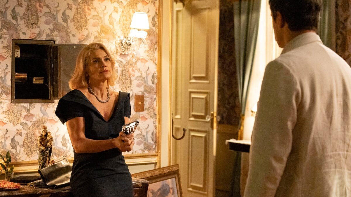 Ela o ameaça com uma arma (Foto: Divulgação, Globo)
