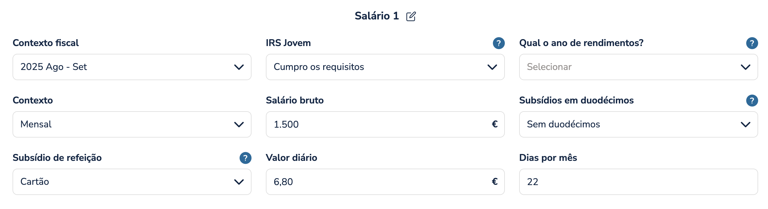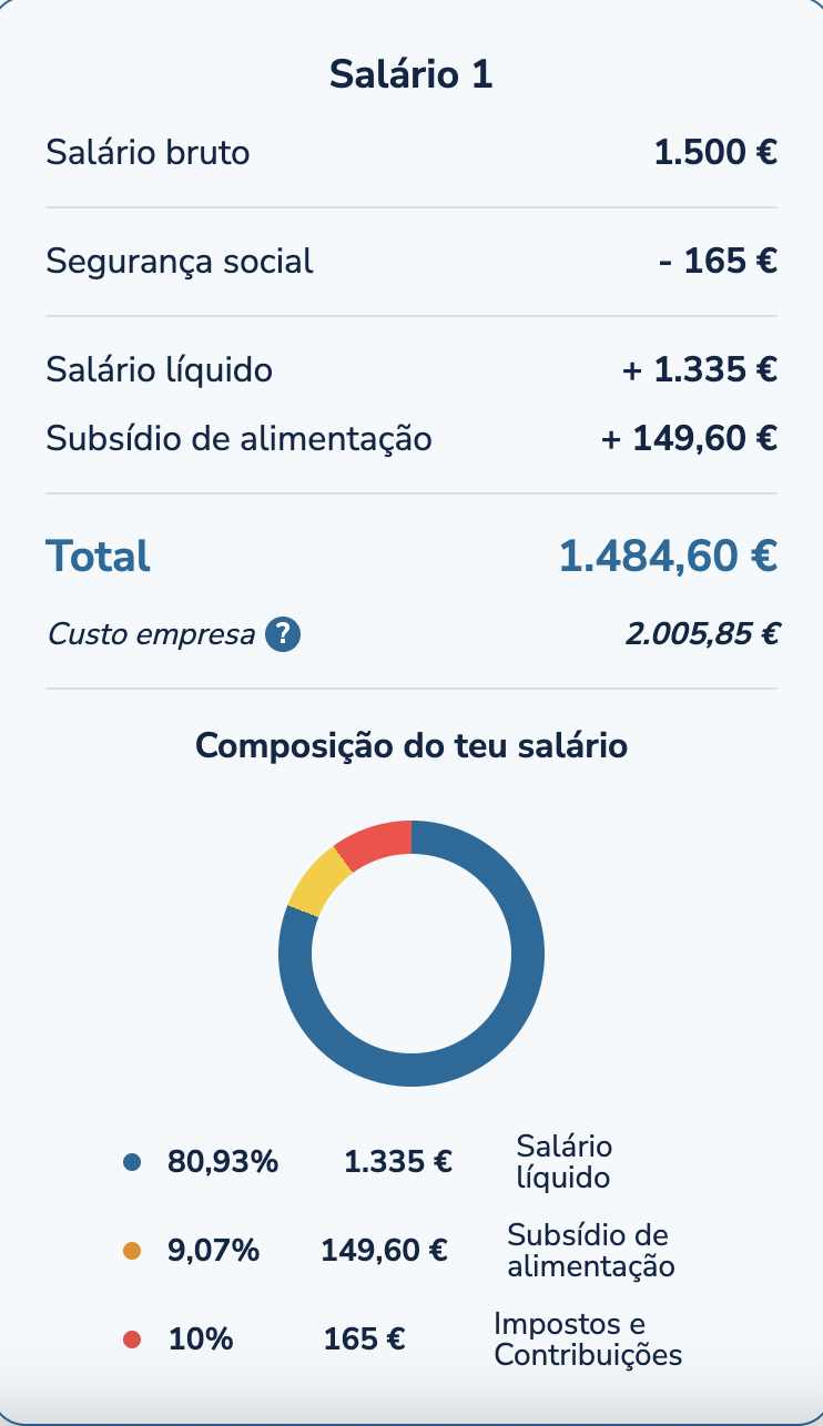 O utilizador obtém o salário líquido mensal, o impacto dos subsídios, a taxa efetiva de IRS aplicada e o custo estimado para o empregador.