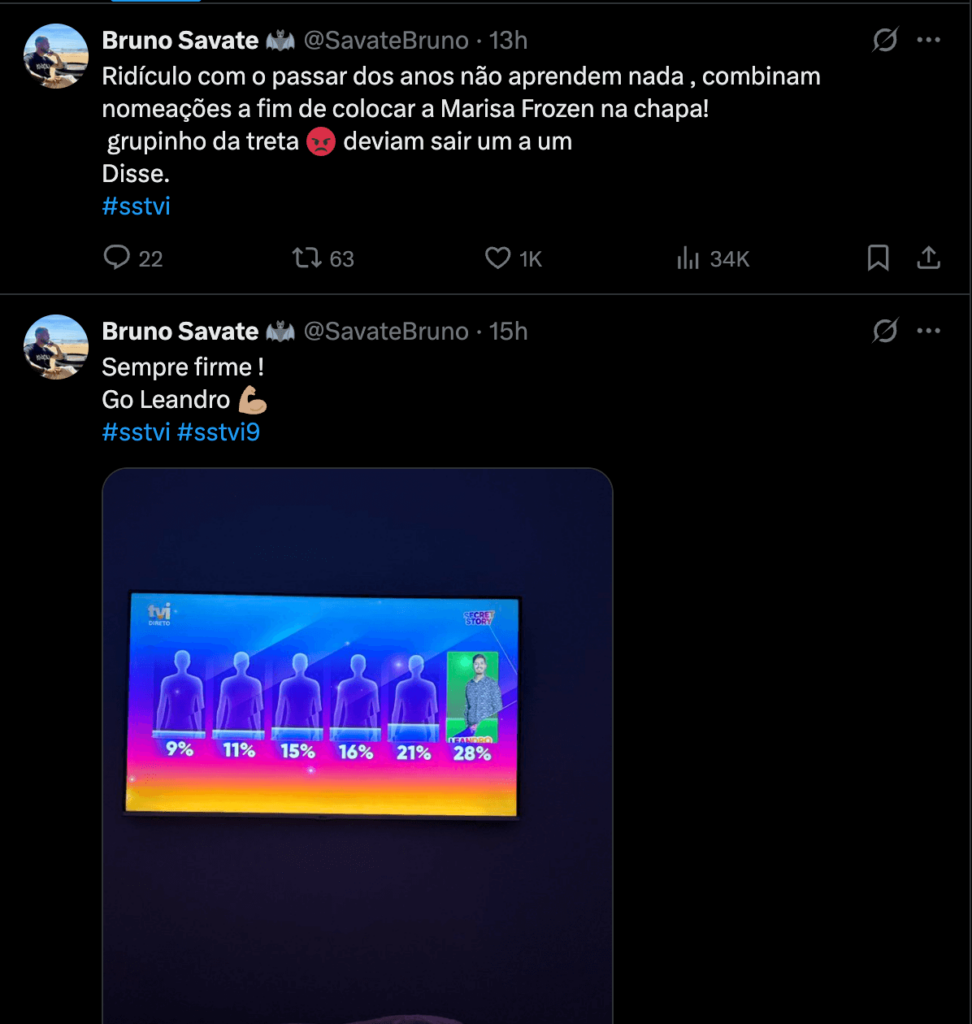 “Sempre firme ! Go Leandro”, celebrou Bruno Savate. Pouco depois, o veterano dos reality shows regressou à rede social X com ‘farpas’ ao grupo contrário e acusa-os de combinarem nomeações: “Ridículo com o passar dos anos não aprendem nada, combinam nomeações a fim de colocar a Marisa Frozen na chapa! Grupinho da treta”.