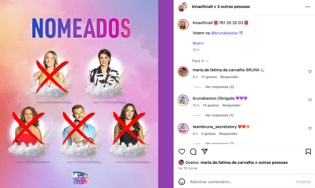 Kina quer ver a salvo Bruna e deixou um apelo pela concorrente no seu Instagram. A estilista deixou o número de voto de Bruna e riscou todas os outros concorrentes nomeados.