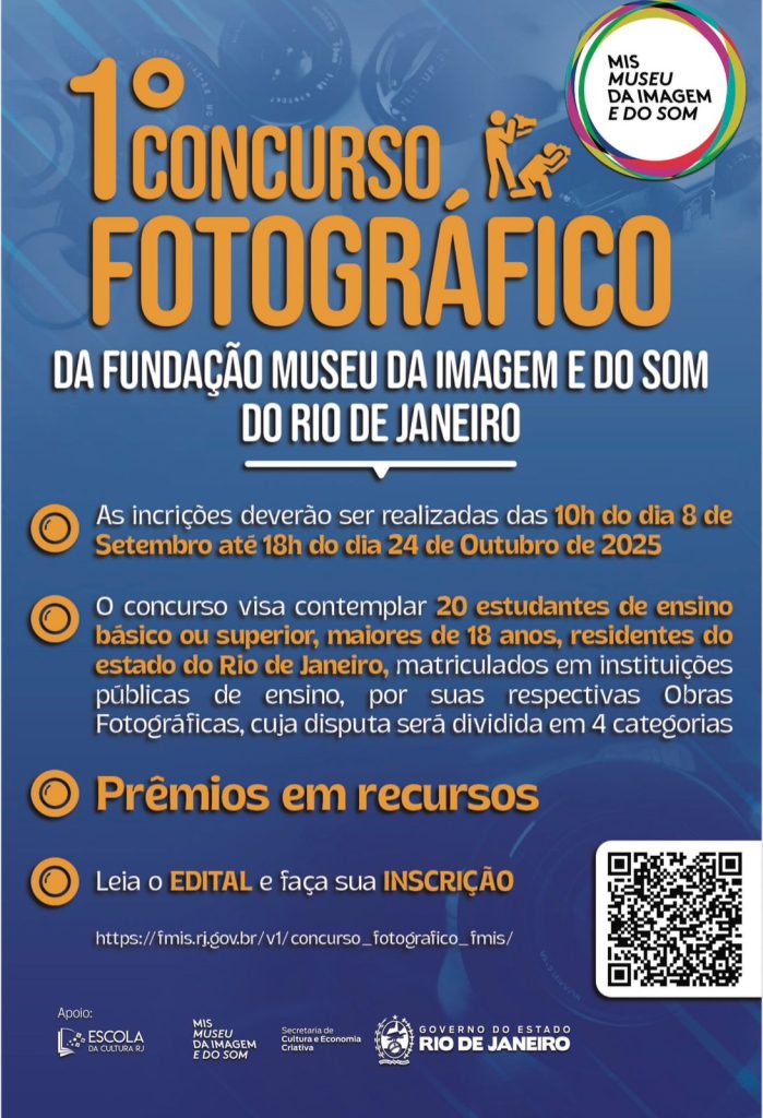 As inscrições para o 1º Concurso Fotográfico da Fundação Museu da Imagem e do Som (F. MIS) do Rio de Janeiro seguem abertas até às 18h do dia 24 de outubro deste ano. A iniciativa é destinada a alunos do ensino básico ou superior, maiores de 18 anos, e matriculados em instituições públicas de ensino fluminense. Serão selecionados 20 candidatos em quatro categorias, com prêmios em recursos financeiros. As inscrições podem ser feitas no site.