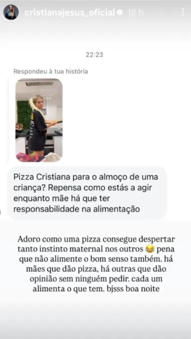 Mas bastou a partilha para que surgisse uma crítica inesperada, “Pizza, Cristiana, para o almoço de uma criança? Repensa como estás a agir enquanto mãe, há que ter responsabilidade na alimentação”, escreveu uma seguidora, que a influenciadora decidiu expor nas redes.