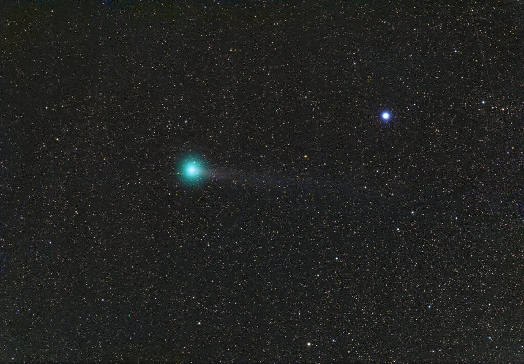 Cometa swan 2 e a estrela Sabik (Eta Ophiuchi) fotografados em 13 de outubro de 2025 em Milton, Louisiana, EUA. Crédito: Mike Broussard via Spaceweather.com