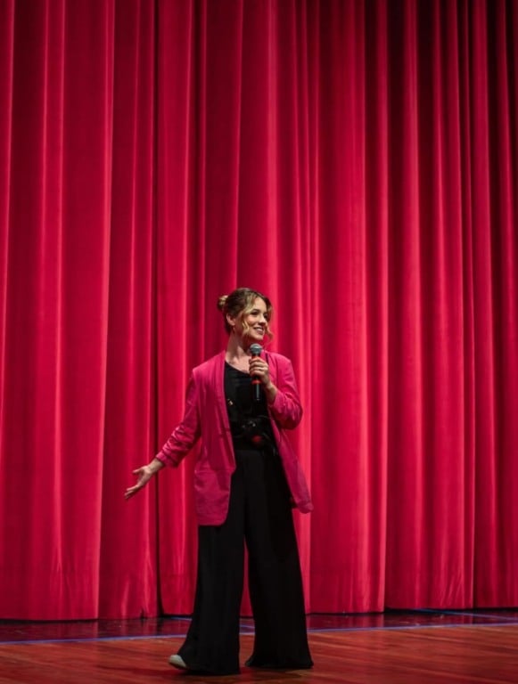 Carol Corleta em cena durante a apresentação da sua escola de balé. A Pink Ballet School, com apenas um ano e meio de trajetória, já realizou quatro espetáculos. Dedicação e paixão marcam cada passo da jovem no palco.