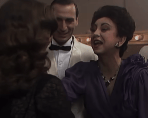 Na cena, a personagem de Beatriz Segall cumprimenta a personagem de Débora nos bastidores de um espetáculo e diz: “Você vai longe, queridinha!” (Foto: Redes sociais, Reprodução)
