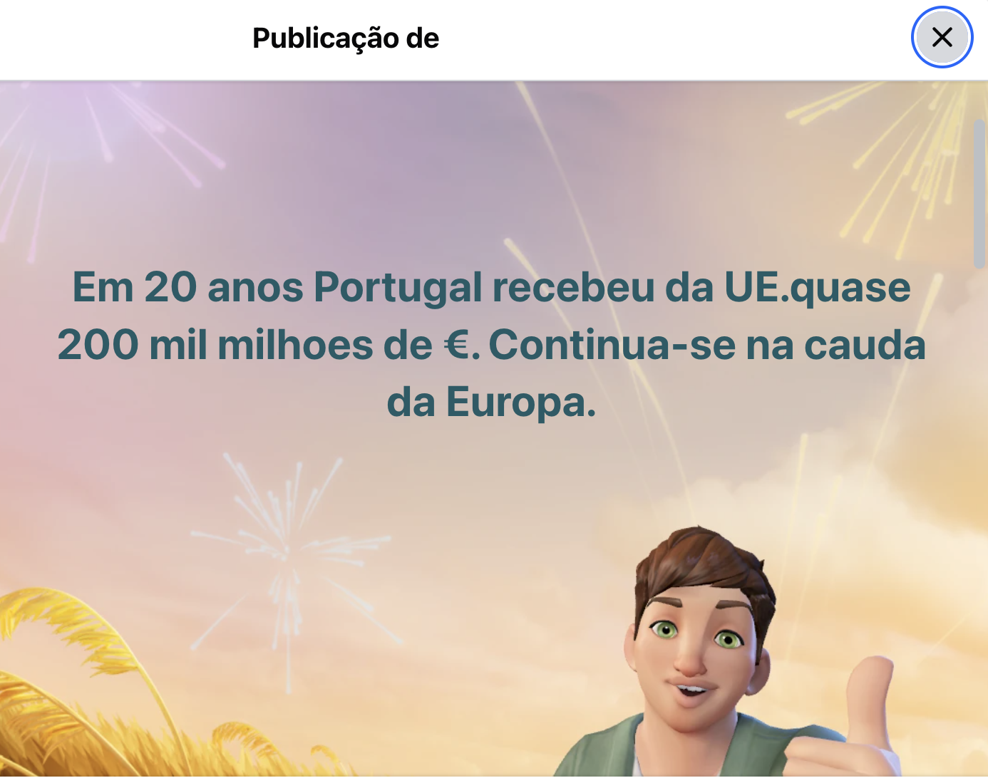 Foi publicado no Facebook um post que indica que Portugal recebeu da União Europeia (UE) “quase 200 mil milhões de euros” em 20 anos. “Continua-se na cauda da Europa”, defende o autor da publicação.