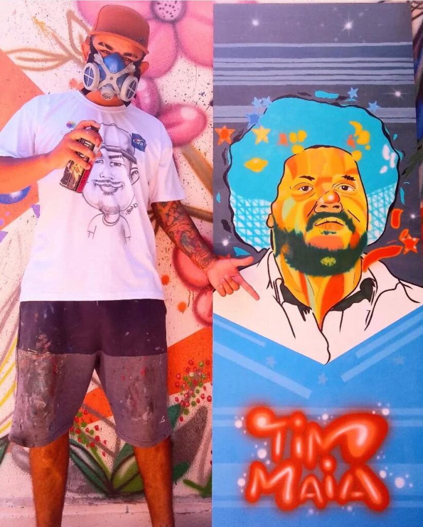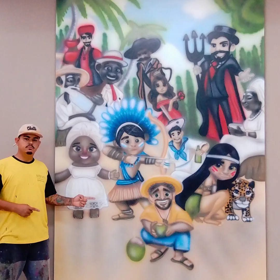 Mateus: “Sabe, o graffiti nunca foi visto como uma profissão. Ele foi a escola que me deu a base para viver da arte. A rua me deu visão, me deu coragem e me ensinou a transformar essa energia do graffiti em pintura artística. Lógico que no começo enfrentei olhares tortos e muito preconceito. Mas o tempo está aí para provar que a arte de rua também é cultura, é comunicação e é trabalho sério. Hoje, cada mural que eu pinto é uma resposta silenciosa a quem duvidou e, principalmente, uma homenagem à quebrada que me formou e me deu essa identidade”