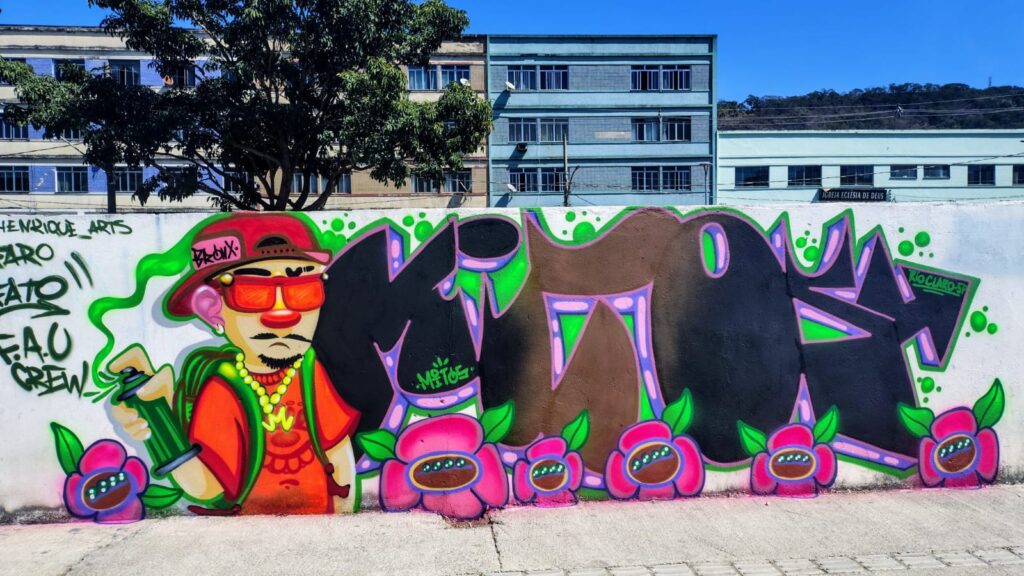 Mateus: “Antes de sair, a gente teve que fortalecer a cena aqui em Rio Claro. Eu participei e ajudei a organizar vários eventos importantes, como o Festival de Graffiti da UNESP – Painel da Inclusão, o Treta do Lago, que celebra os quatro elementos do hip-hop, e a exposição no Centro Cultural Paulo Rodrigues. Além disso, organizo a ‘Sopa de Letras’, aqui na cidade, um evento que reúne a galera da cidade e região e de outros estados. Esses encontros são a base do meu crescimento. Depois dessa caminhada, recentemente tive a honra de representar meu trabalho fora, participando do Encontro de Arte Urbana em Juiz de Fora (MG). Levar o nome da minha cidade e, principalmente, do meu bairro Mãe Preta para outro estado foi um dos momentos mais marcantes”.