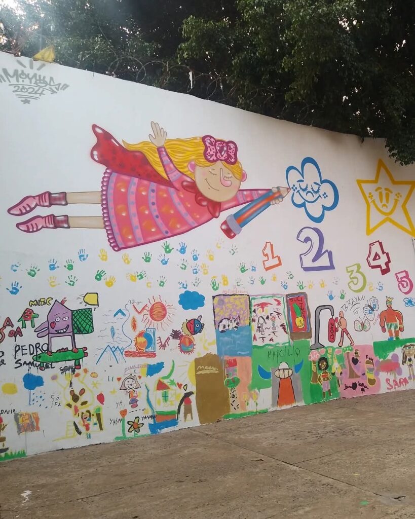 Mateus: “Levar o graffiti para dentro das escolas é levar consciência e oportunidade. A recepção é sempre incrível porque os alunos se identificam, eles enxergam na arte uma linguagem que é próxima da realidade deles. Eles aprendem que a arte também é educação, respeito e que pode gerar oportunidades. Nas oficinas que eu realizo, eu vejo jovens descobrindo talentos que nem sabiam que tinham, aprendendo sobre foco e ganhando autoestima. O graffiti na escola é mais do que só pintar um muro — é uma ferramenta poderosa de transformação social e pessoal”