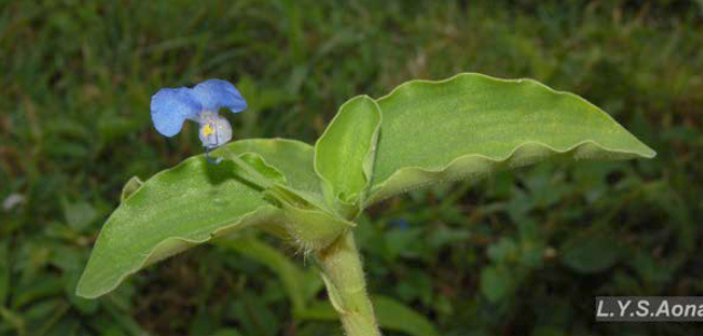 Detalhe das folhas e flor de Commelina benghalensis L. – Foto: AONA (2016) / Livro Entendendo as plantas daninhas