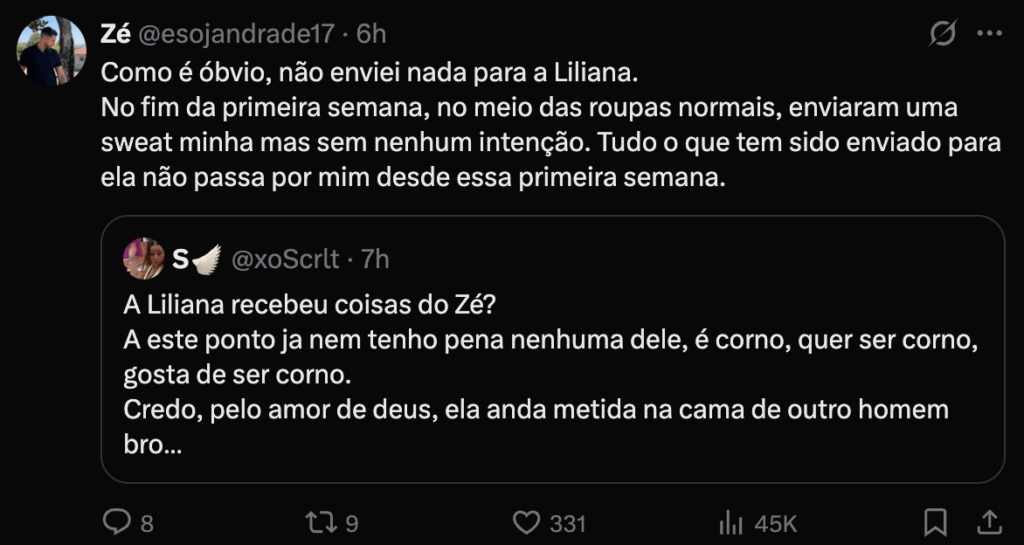 O ex-noivo da concorrente já reagiu e foi obrigado a fazer um esclarecimento, deixando bem claro que desde a primeira semana do programa, que deixou de mandar fosse o que fosse para Liliana.