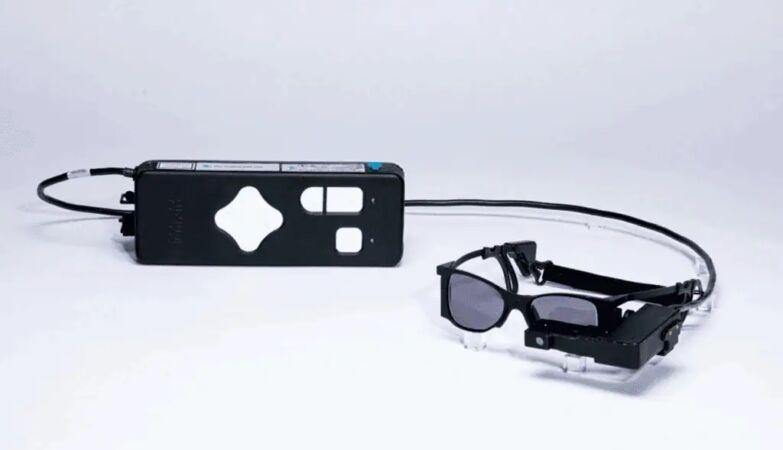 O sistema PRIMA inclui óculos de realidade aumentada que enviam sinais para um chip sem fios implantado no olho do utilizador