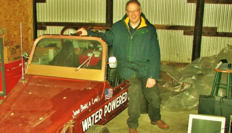 Stanley Meyer ao lado do seu carro a água. Alegava que 83 litros de água dava para percorrer os Estados Unidos de Los Angeles a Nova Iorque, uma distância de 4488 quilómetros.