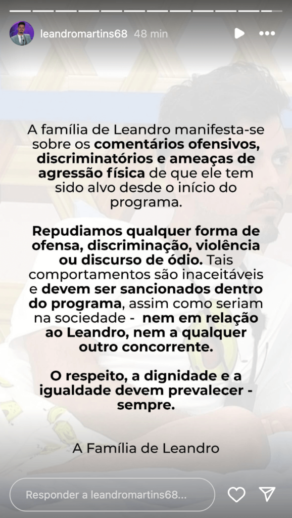 A família do concorrente mostrou-se revoltada com todos os comentários ofensivos que o concorrente tem sido alvo e apelam por uma sanção: “Repudiamos qualquer forma de ofensa, discriminação, violência ou discurso de ódio. Tais comportamentos são inaceitáveis e devem ser sancionados dentro do programa, assim como seriam na sociedade – nem em relação ao Leandro, nem a qualquer outro concorrente.”