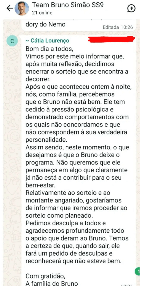 O alegado comunicado terá sido enviado por Watts app por Cátia Lourenço, familiar do concorrente, para a Team de Bruno e assinado em nome da família. Corre nas redes sociais o print do referido comunicado, em que a família apela para que se cancele o apoio a Bruno e que deixam claro que não apoiam algumas das suas atitudes na casa mais vigiada do país.