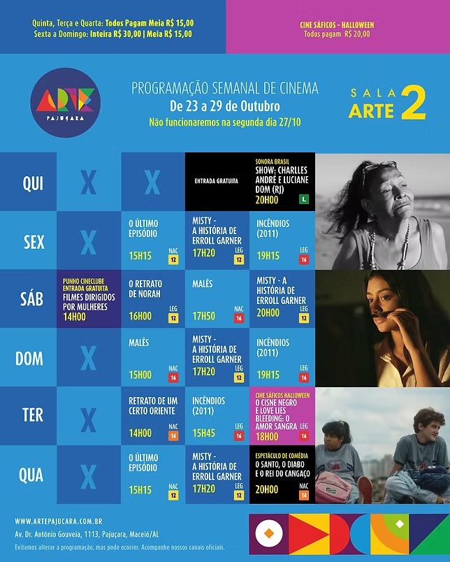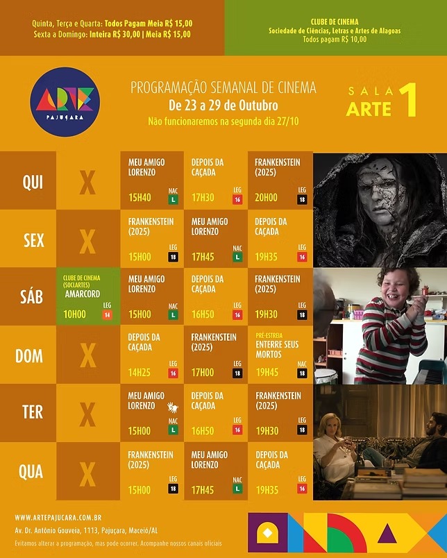Para conferir a programação completa de todos os filmes em cartaz no Arapiraca Partage Shopping, Centerplex (Shopping Pátio Maceió), Cinesystem (Parque Shopping) e Kinoplex (Maceió Shopping): basta clicar aqui. Já para o Shopping da Vila, em Delmiro Gouveia, pode ser conferida aqui.