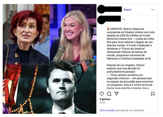 Sobre a doação de Sharon Osbourne ao fundo de Charlie Kirk, não existe qualquer sustentação das informações que são apresentadas nas publicações das redes sociais. Nunca houve qualquer declaração pública da apresentadora de televisão em relação a este assunto — nem nas suas redes sociais, nem em qualquer fonte oficial credível.