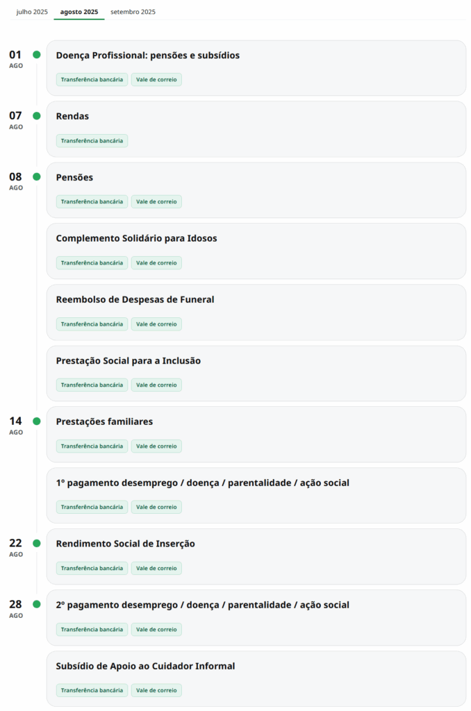 No dia 7 será pago o apoio à renda, enquanto no dia seguinte, 8 de agosto, chegam o Complemento Solidário para Idosos, as pensões, a Prestação Social para a Inclusão e o Reembolso de Despesas de Funeral.