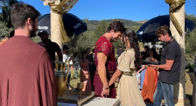Os artistas gravaram as cenas do casamento durante viagem do elenco para Poços de Caldas, em Minas Gerais. A celebração aconteceu em meio às oliveiras de uma fazenda de azeite, que serviu de locação para a minissérie e encantou o elenco. Para Dudu, o momento é a materialização do amor de Caius e Elisa.