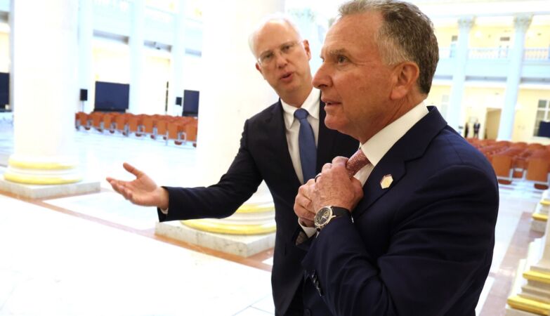 Kirill Dmitriev, representante presidencial especial de Vladimir Putin para o investimento e a cooperação económica (esq) com Steve Witkoff, enviado de especial de Donald Trump (dir)