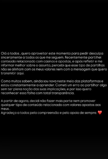 “Olá a todos. Quero aproveitar este momento para, sinceramente, pedir desculpa a todos os que me seguem. Recentemente, partilhei conteúdo relacionado com casinos e apostas, e após refletir e me informar melhor sobre o assunto, percebi que esse tipo de partilhas não se alinha com os meus valores nem com a mensagem que quero transmitir aqui”, começou por referir Vera numa mensagem.