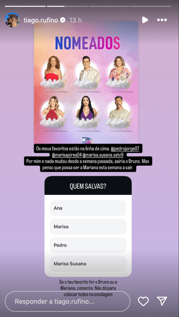 “Os meus favoritos estão na linha de cima. [Pedro Jorge] pedrojorge07, [Marisa] @marisapires04, [Marisa Susana] @marisa.susana.sstv9. Por mim e nada mudou desde a semana passada, sairia o Bruno. Mas penso que possa ser a Mariana esta semana a sair.”, começou por dizer Tiago Rufino, que acrescentou de seguida: “Se o teu favorito for o Bruno ou a Mariana, comenta. Não dá para colocar todos na sondagem”.