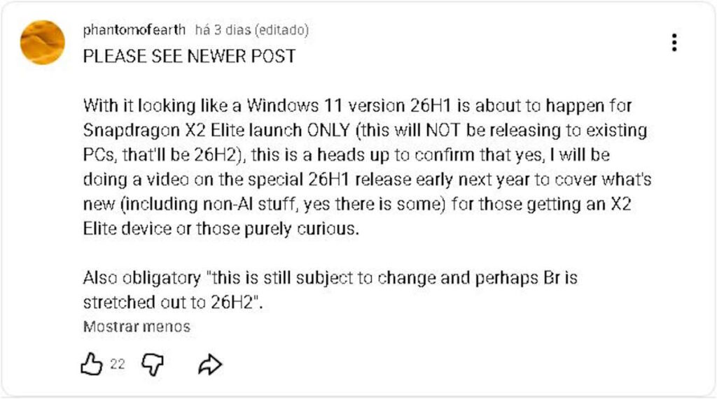 Com tudo a indicar que a versão 26H1 do Windows 11 está prestes a ser lançada EXCLUSIVAMENTE para o Snapdragon X2 Elite (esta versão NÃO será disponibilizada para os PCs existentes, que receberão a versão 26H2), este aviso serve para confirmar que irei fazer um vídeo sobre o lançamento especial da versão 26H1 no início do próximo ano, abordando as novidades (incluindo funcionalidades não relacionadas com a IA, sim, existem algumas) para aqueles que adquirirem um dispositivo X2 Elite ou para aqueles que simplesmente tiverem curiosidade.