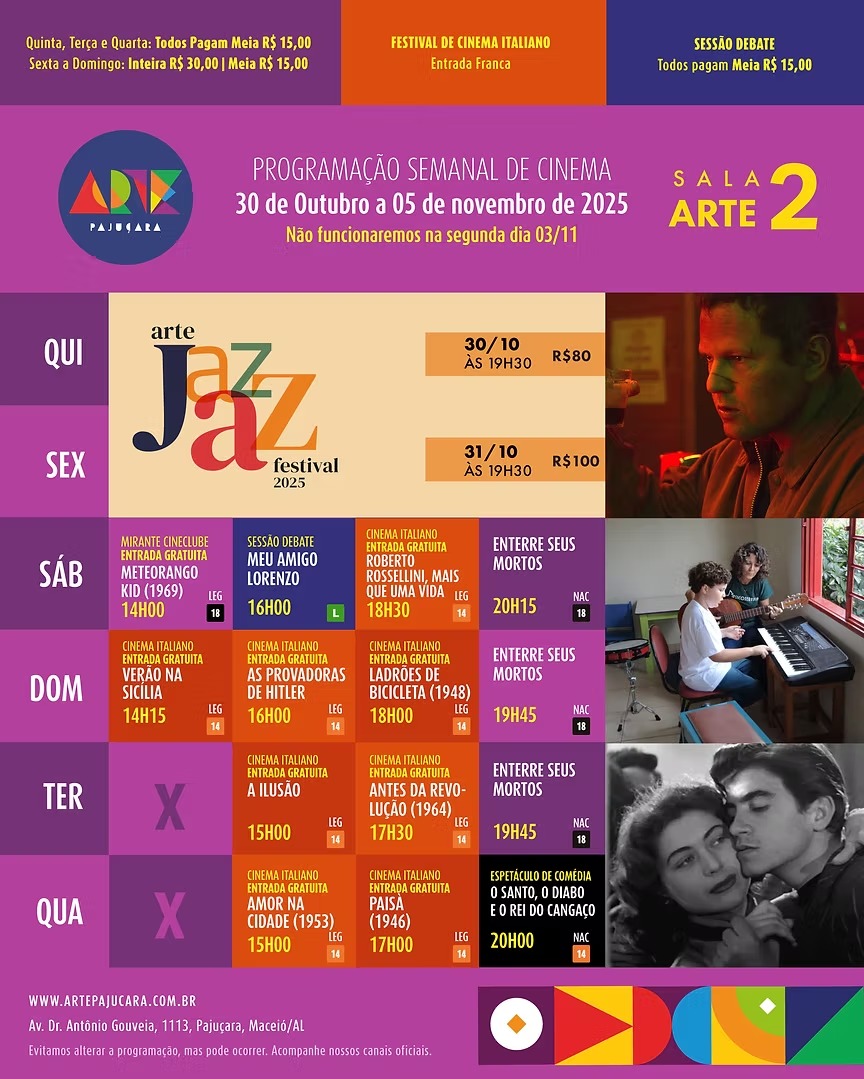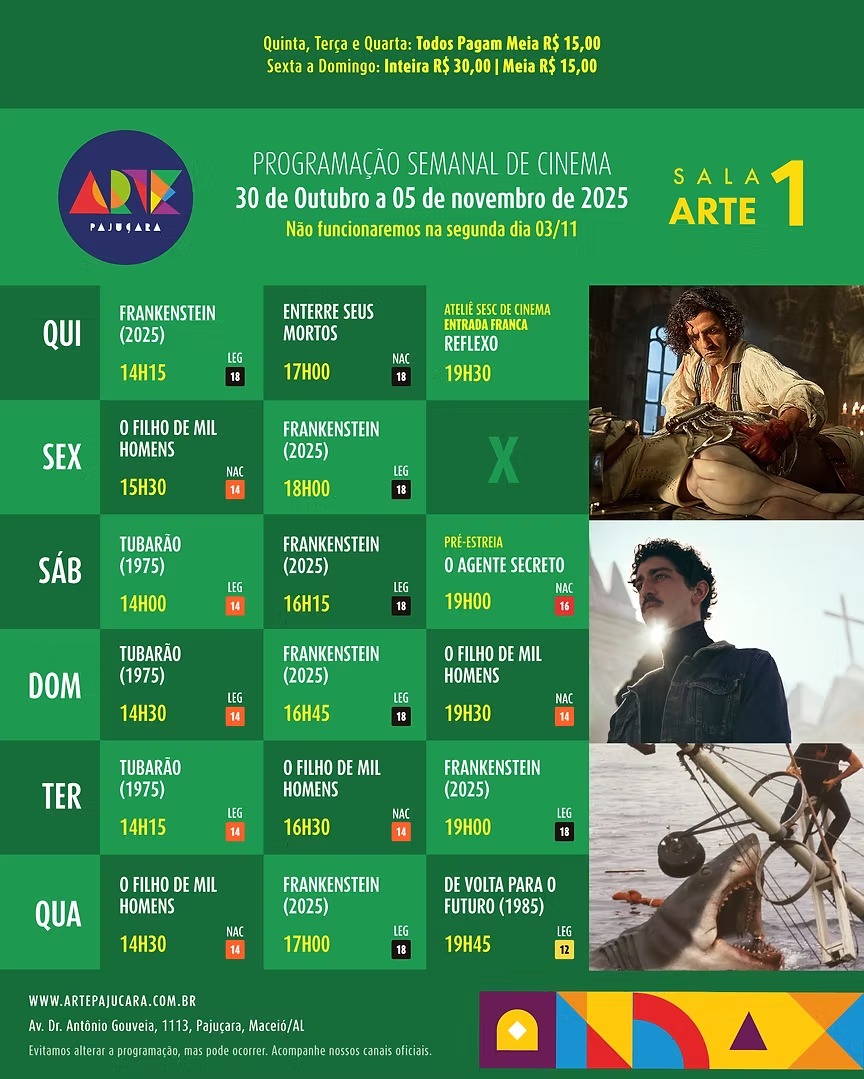 Para conferir a programação completa de todos os filmes em cartaz no Arapiraca Partage Shopping, Centerplex (Shopping Pátio Maceió), Cinesystem (Parque Shopping) e Kinoplex (Maceió Shopping): basta clicar aqui. Já para o Shopping da Vila, em Delmiro Gouveia, pode ser conferida aqui.