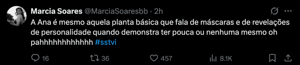 “Aiii Ana qual é a tua história na casa mesmo?”, começou por dizer Marcia Soares que acrescentou de seguida: “A Ana é mesmo aquela planta básica que fala de máscaras e de revelações de personalidade quando demonstra ter pouca ou nenhuma mesmo oh pahhhhhhhhhhhh”.